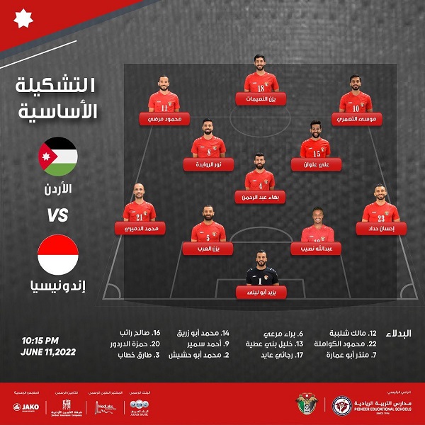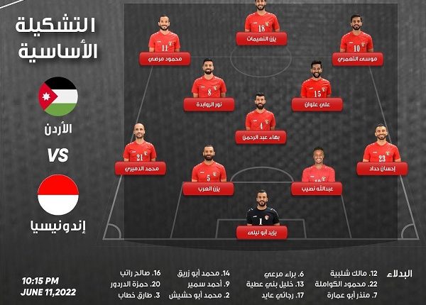تشكيلة المنتخب الأردني أمام إندونيسيا ( شاهد ) On يونيو 11, 2022 Share وكالة الناس – نشر الاتحاد الأردني لكرة القدم تشكيلة النشامى لمواجهة إندونيسيا ضمن التصفيات الآسيوية المقامة مساء اليوم السبت. وجاءت على النحو التالي: