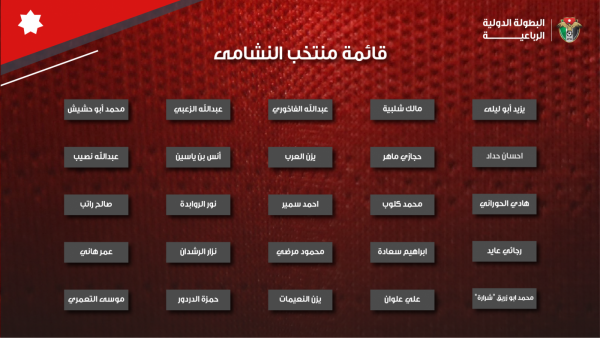 وضمت القائمة: يزيد أبو ليلى، مالك شلبية، عبد الله الفاخوري، عبدالله الزعبي، محمد أبو حشيش، محمد كلوب، إحسان حداد، حجازي ماهر، أنس بني ياسين، يزن العرب، عبدالله نصيب، هادي الحوراني، صالح راتب، أحمد سمير، نور الروابدة، رجائي عايد، إبراهيم سعادة، نزار الرشدان، محمود المرضي، موسى التعمري، عمر هاني، محمد أبو زريق “شرارة”، علي علوان، يزن النعيمات، حمزة الدردور.