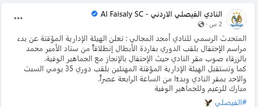 وقال المجالي وفق ما نقل الحساب الرسمي للفيصلي على فيسبوك، “تستقبل الهيئة الإدارية المؤقتة المهنئين بلقب دوري 35 يومي السبت والاحد بمقر النادي وبدءًا من الساعة الرابعة عصراً”.