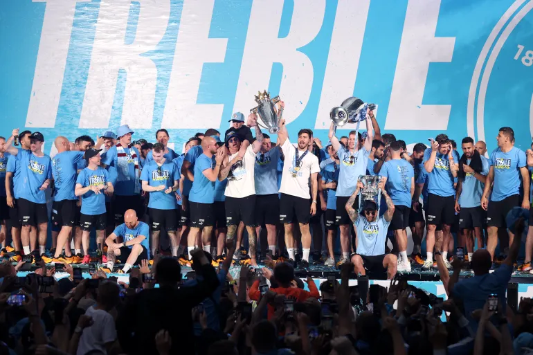 وتوّج سيتي بلقب الدوري الإنجليزي الممتاز في 20 من الشهر الماضي، وظفر بكأس الاتحاد الإنجليزي في الثالث من الشهر الحالي، قبل أن يضيف لقبه التاريخي الأول في مسابقة دوري أبطال أوروبا السبت بالفوز على إنتر ميلان بهدف في المباراة النهائية بإسطنبول، معادلا إنجاز جاره يونايتد عام 1999.