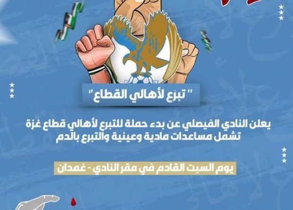 وكالة الناس –  اعلن النادي الفيصلي عن تنظيم حملة للتبرع بالدم والمواد العينية والنقدية، دعما للأهل في غزة.