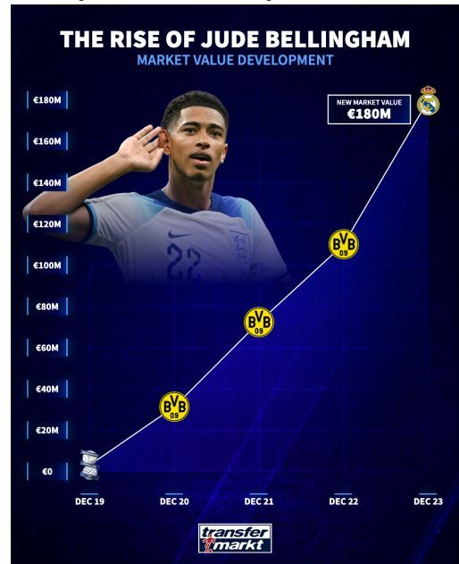 تحولت قيمة بيلينغهام السوقية من ديسمبر 2019 إلى نفس الشهر من العام الحالي 2023، من 11 مليون إلى 180 مليون يورو.