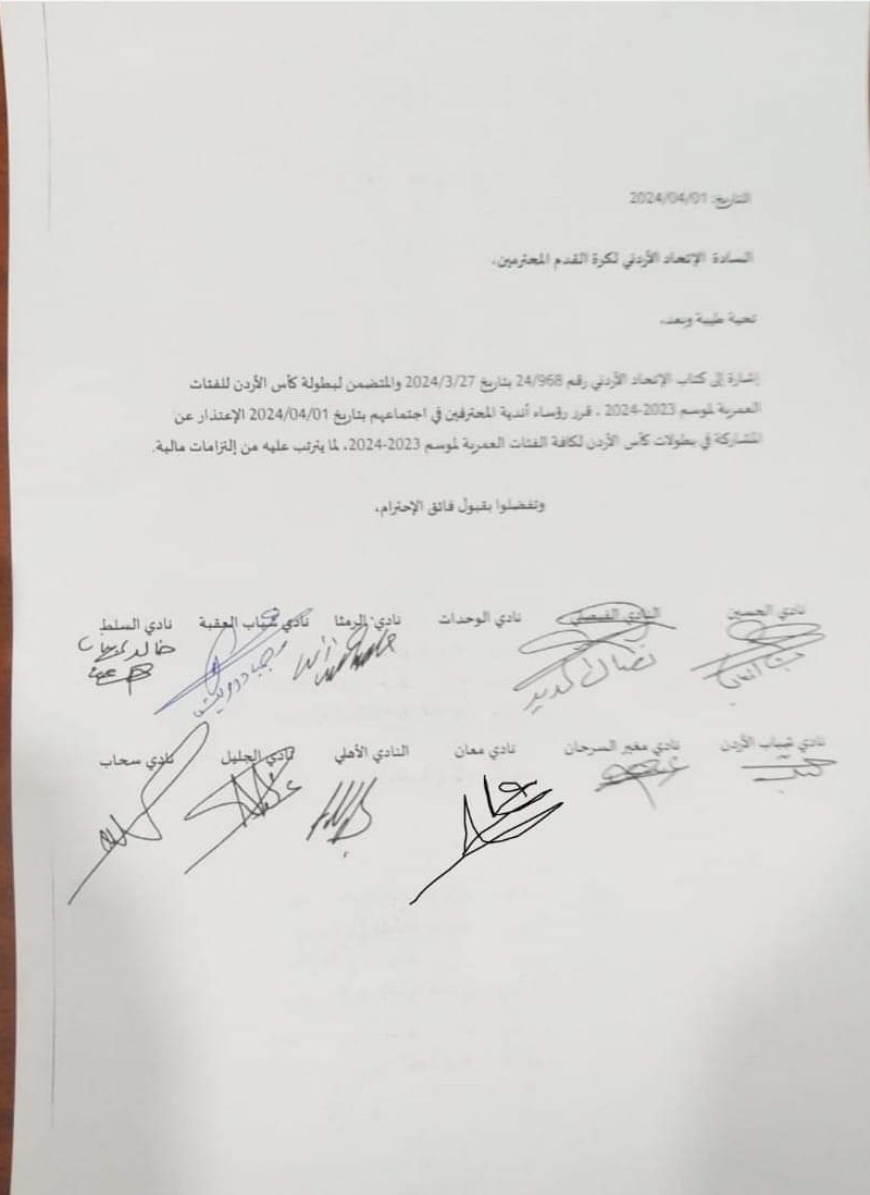وكالة الناس -ابلغت أندية المحترفين الاتحاد الأردني لكرة القدم اعتذارها عن عدم المشاركة في كأس الأردن للفئات العمرية للموسم 2023 -2024.