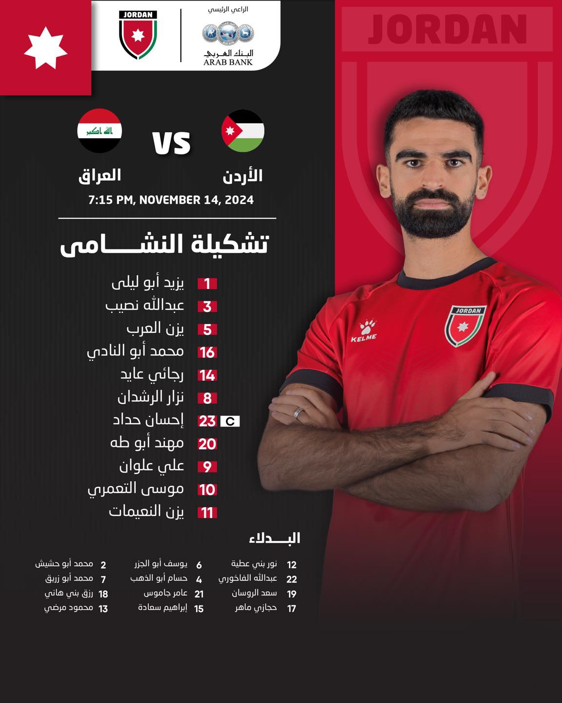 وكالة الناس — أعلن المنتخب الوطني مساء اليوم الخميس، عن التشكيلة الأساسية التي ستخوض مباراة النشامى ومنتخب العراق في ملعب البصرة الساعة السابعة والربع ليلًا.