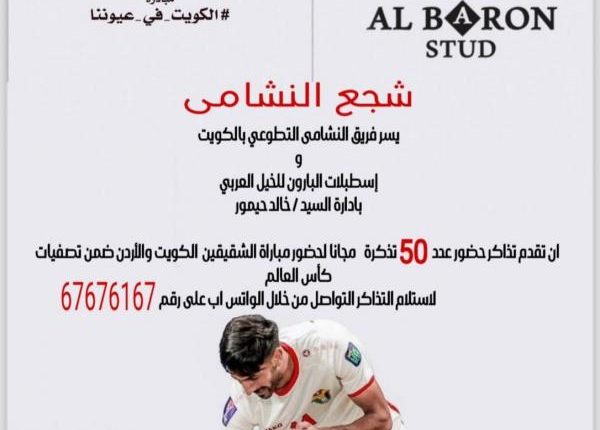 وكالة الناس – اعلن فريق النشامى الاردني التطوعي في الكويت بالتعاون مع اسطبلات البارون للخيل العربي، تقديم 50 تذكرة مجانية لحضور مباراة الاردن والكويت ضمن تصفيات كأس العالم اليوم الثلاثاء.