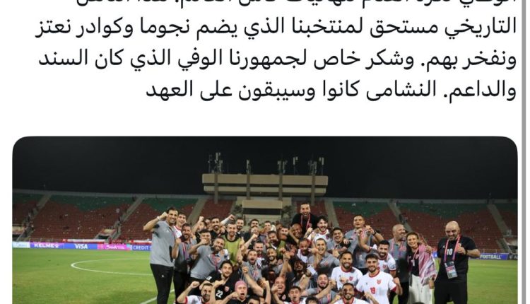 وغرد جلالته عبر منصة “اكس” : أهنئ من قلبي أبناء وبنات شعبنا العزيز بتأهل منتخبنا الوطني لكرة القدم لنهائيات كأس العالم. هذا التأهل التاريخي مستحق لمنتخبنا الذي يضم نجوما وكوادر نعتز ونفخر بهم. وشكر خاص لجمهورنا الوفي الذي كان السند والداعم. النشامى كانوا وسيبقون على العهد