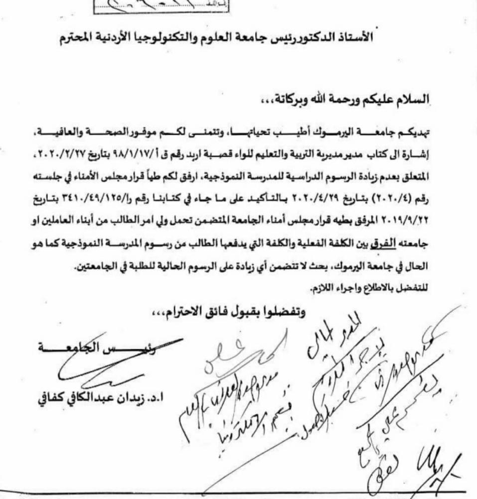 ويشير كتاب موجه من رئيس مجلس امناء جامعة اليرموك لرئيس جامعة العلوم في الحادي والعشرين من ايار الماضي الى ان المجلس لم يقر أي زيادة على الرسوم الدراسية وانما قرر تحميل اولياء الامور العاملين في الجامعة او الجامعة ذاتها الفروقات بين الكلفة الفعلية للطالب والكلفة التي يدفعها ، ما اعتبره العاملون محاولة التفافية غايتها زيادة الرسوم اولا ووضعهم في مواجهة مع جامعتهم بغية مطالبتها بتحمل الفروقات وهو امر مستبعد ولا نظم او تشريعات يمكن ان تقره .