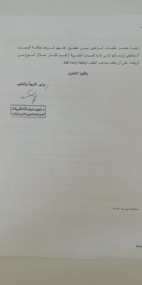 وعممت الوزارة كتابا لملء الشواغر القيادية الـ 12 لمن تنطبق عليهم شروط الوصف الوظيفي من موظفي الوزارة للتقدم بطلبات الى إدارة الموارد البشرية.