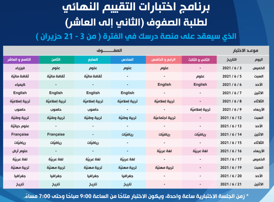 وكالة الناس – نشرت وزارة التربية والتعليم، السبت، برنامج اختبارات التقييم النهائي، للفصل الدراسي الثاني 21/20، للصفوف من الثاني ولغاية الحادي عشر.