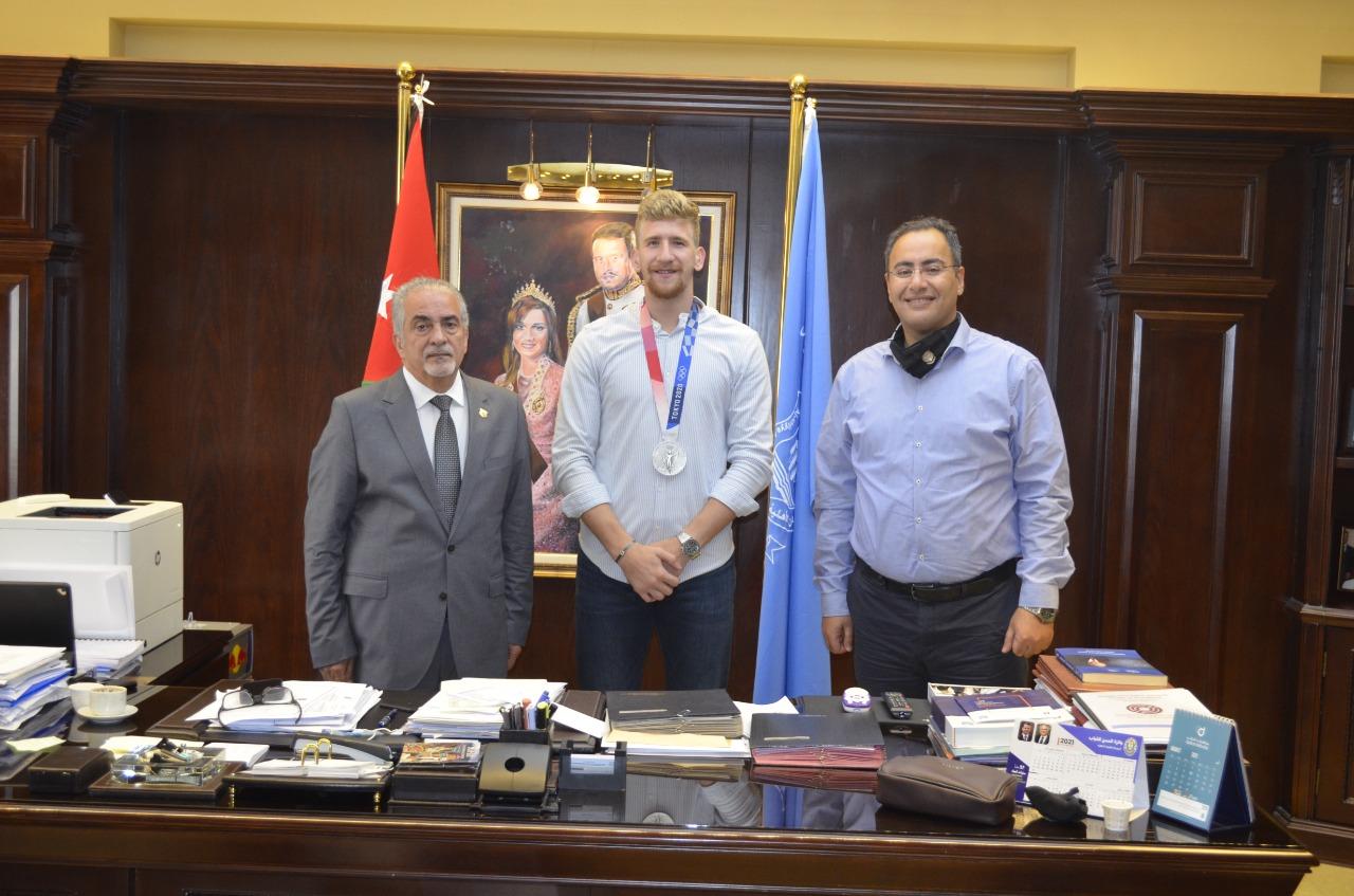 وكالة الناس – التقى رئيس جامعة عمان الاهلية الأستاذ الدكتور ساري حمدان مع اللاعب صالح الشرباتي الطالب في كلية الأعمال بالجامعة والحاصل على الميدالية الفضية في أولمبياد طوكيو 2021 بحضور عميد شؤون الطلبة الدكتور مصطفى العطيات اليوم الأربعاء الموافق 11/8/2021، وقام بتهنئته على إنجازه، وتمنى له المزيد من النجاحات التي ترفع راية المملكة الأردنية الهاشمية خفاقة في كافة المحافل العربية والآسيوية والدولية.