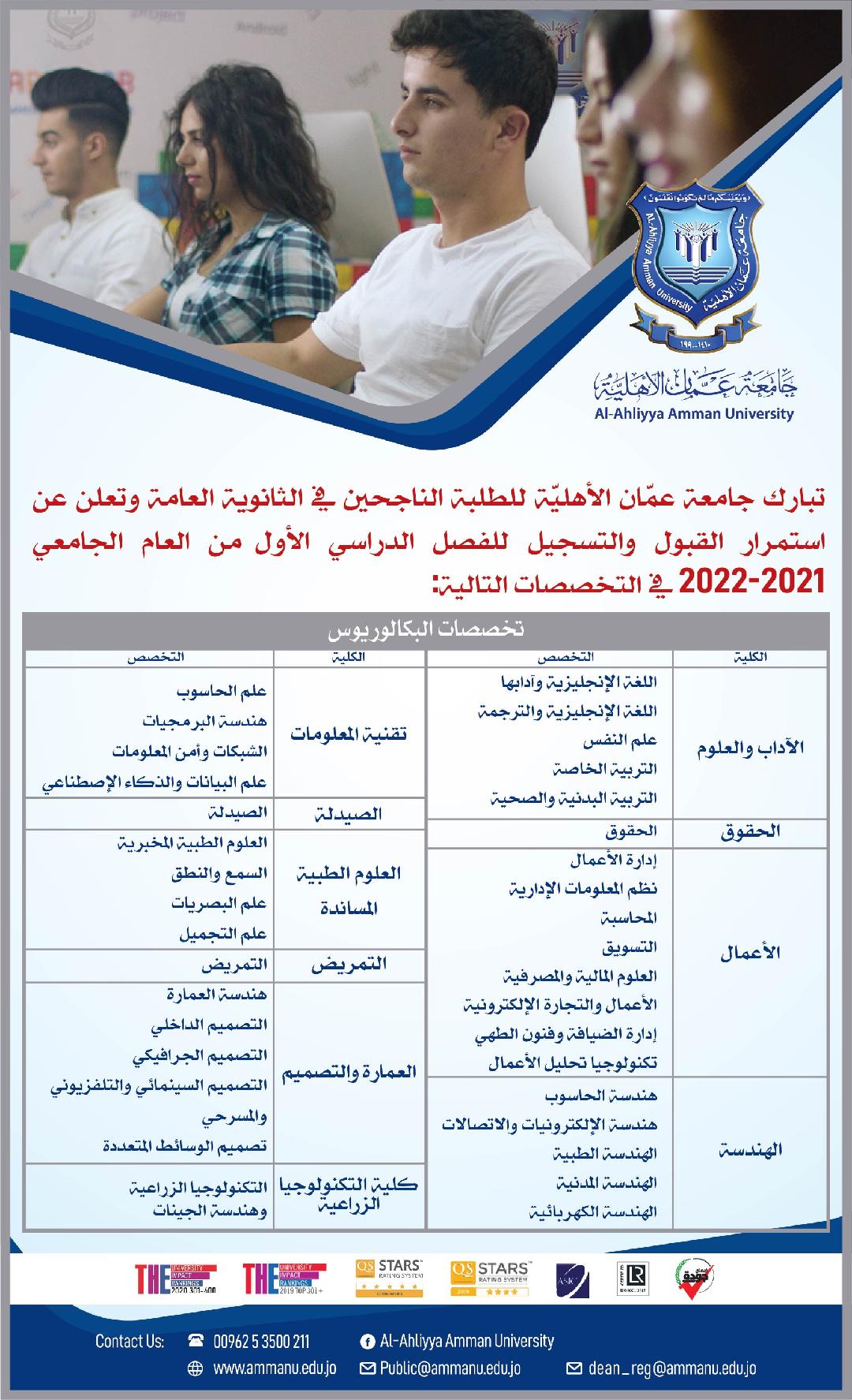 وكالة الناس – تبارك جامعة عمان الأهلية للطلبة الناجحين في الثانوية العامة وتعلن عن استمرار القبول والتسجيل للفصل الدراسي الأول من العام الجامعي 2021-2022في تخصصات