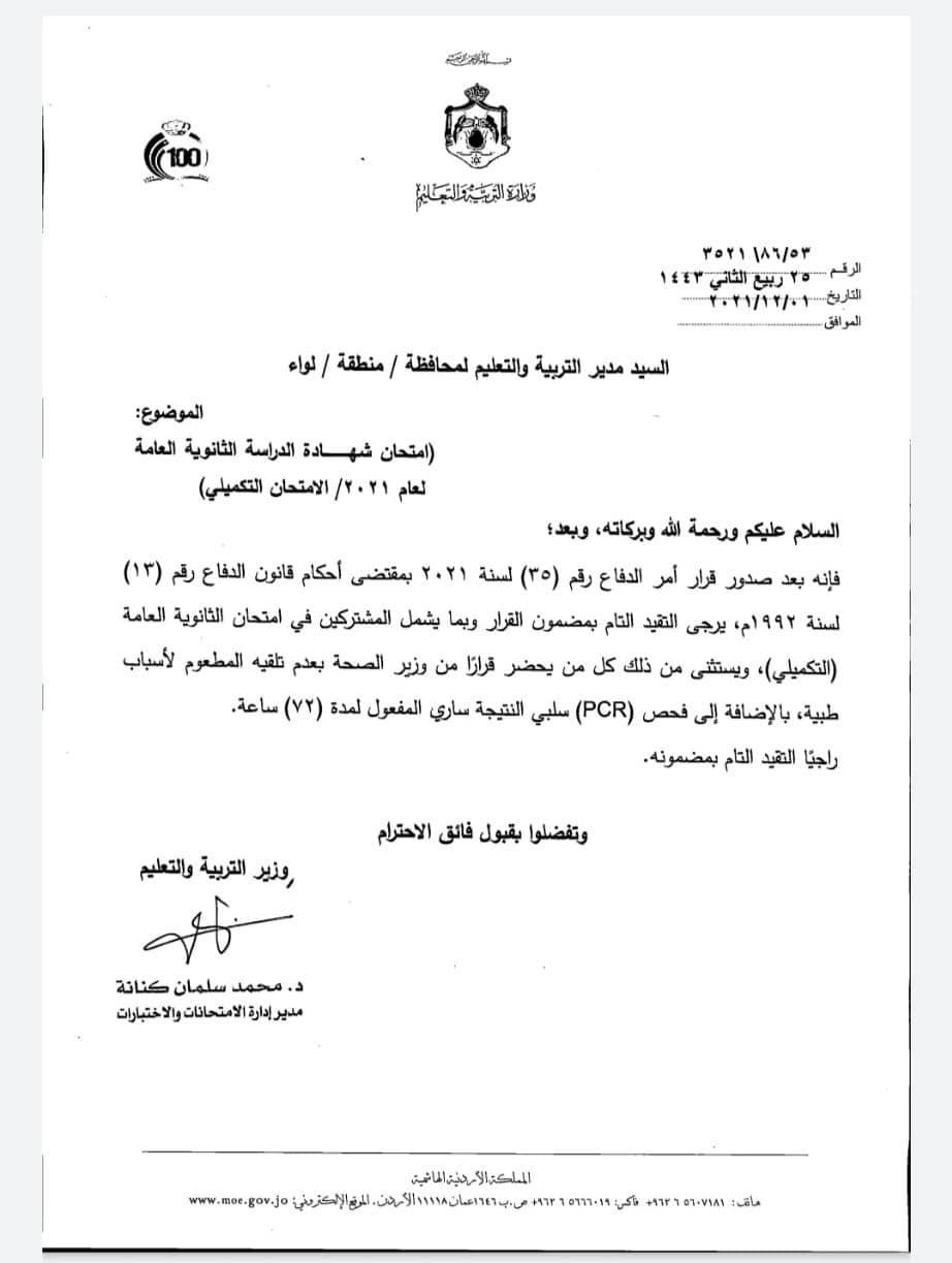 يذكر أن امتحانات تكميلية التوجيهي تبدأ يوم الخميس 30 كانون الأول الحالي وتنتهي يوم السبت 22 كانون الثاني المقبل.