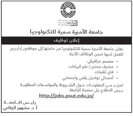 جامعة الاميرة سمية ترغب بتعيين موظفين اداريين