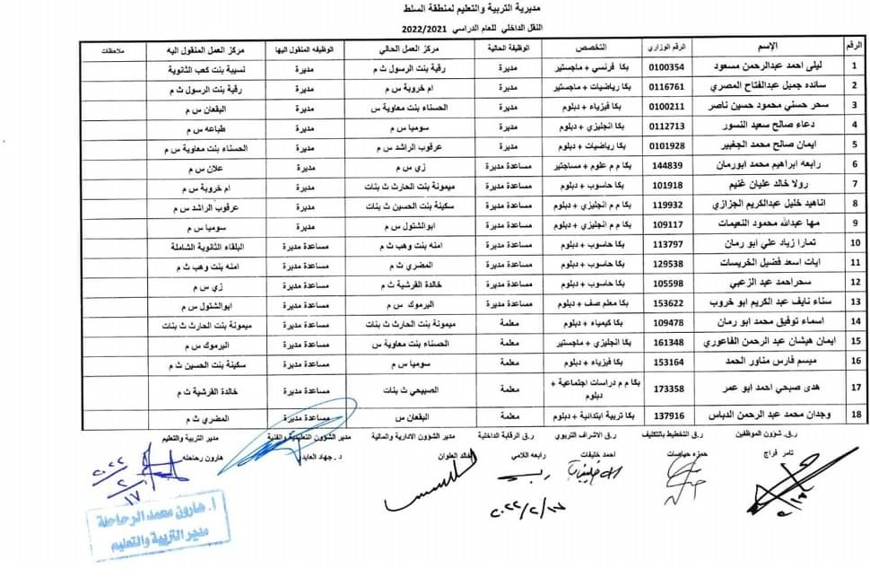 تنقلات في تربية السلط (أسماء) On فبراير 17, 2022 Share وكالة الناس – قرر مدير التربية والتعليم في السلط هارون الرحاحلة اجراء تشكيلات ادارية. وتاليا الأسماء: