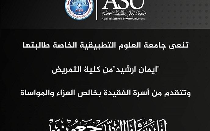 وقالت الجامعة: “بقلوب يعتصرها الألم ومؤمنة بقضاء الله تعالى وقدره تنعى جامعة العلوم التطبيقية الخاصة طالبتها “إيمان ارشيد” من كلية التمريض”.