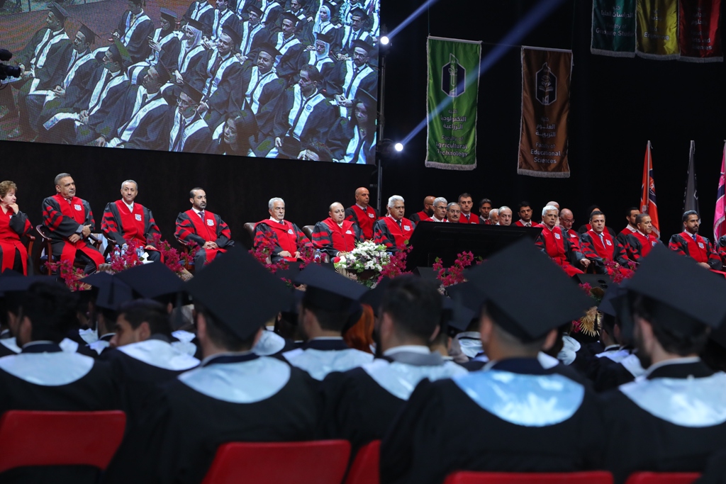 •وقد بُدىء الحفل بكلمة الجامعة لعميد شؤون الطلبة الدكتور مصطفى عطيات رحب فيها بعطوفة راعي الحفل الدكتور ماهر الحوراني وبأعضاء مجلس أمناء الجامعة وعطوفة الأستاذ الدكتور ساري حمدان رئيس الجامعة والسادة العمداء وأعضاء الهيئتين التدريسية والادارية والطلبة الخريجين وذويهم .