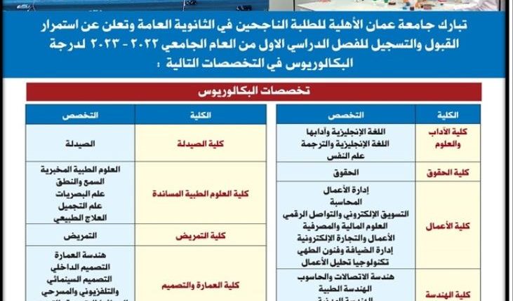 وكالة الناس – تبارك جامعة عمان الأهلية للطلبة الناجحين في الثانوية العامة وتعلن عن استمرار القبول والتسجيل للفصل الدراسي الاول من العام الجامعي 2022 – 2023 لدرجة البكالوريوس في التخصصات التالية :