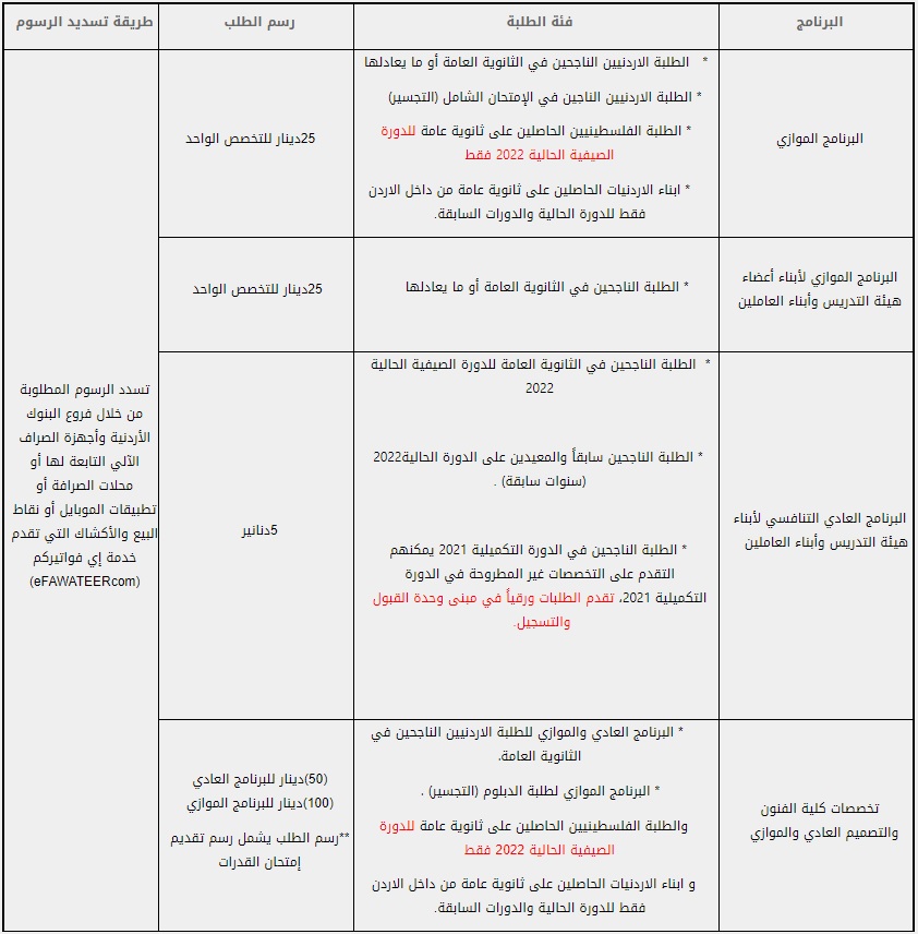 و تسدد الرسوم المطلوبة من خلال فروع البنوك الأردنية وأجهزة الصراف الآلي التابعة لها أو محلات الصرافة أو تطبيقات الموبايل أو نقاط البيع والأكشاك التي تقدم خدمة إي فواتيركم (eFAWATEERcom) بعد تقديم الطلب إلكترونياً حيث يظهر للطالب رقم الدفع الالكتروني بعد الانتهاء من اختيار التخصصات.