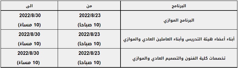 وسيتم تحديد موعد إمتحان القبول في تخصصات كلية الفنون والتصميم على البرنامجين العادي والموازي للفصل الأول 2023/2022 لاحقاً.