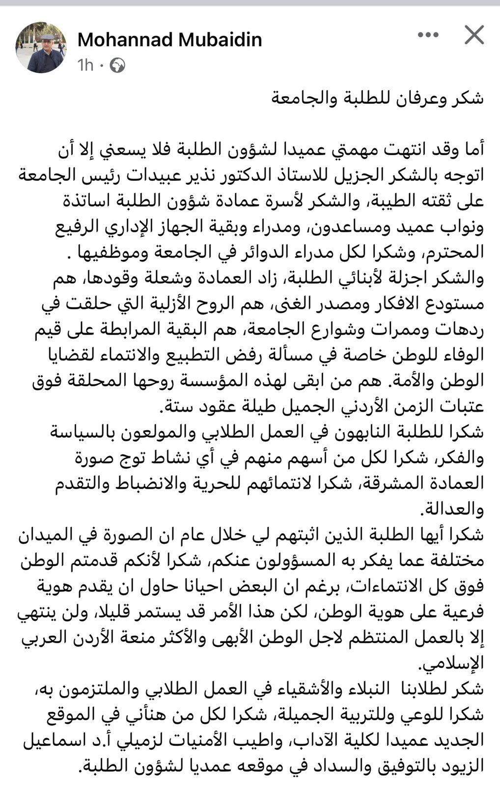 وختم، ” شكر لطلابنا النبلاء والأشقياء في العمل الطلابي والملتزمون به، شكرا للوعي وللتربية الجميلة، شكرا لكل من هنأني في الموقع الجديد عميدا لكلية الآداب، واطيب الأمنيات لزميلي أ.د اسماعيل الزيود بالتوفيق والسداد في موقعه عمديا لشؤون الطلبة”.