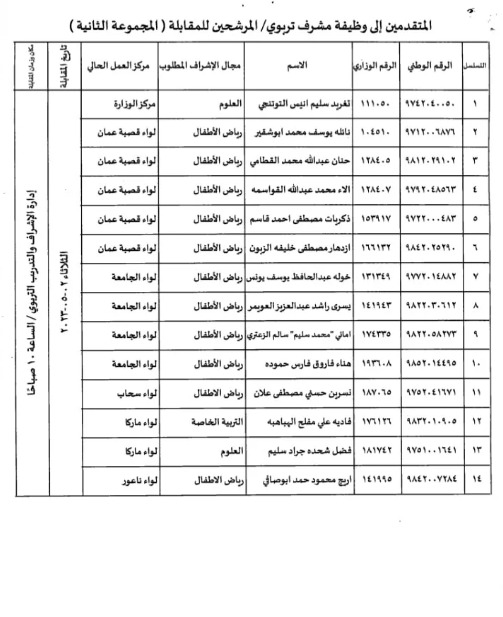 وستبدأ الوزارة بإجراء المقابلات للمجموعة الثانية من تاريخ الـ 2 من أيار المقبل، وستستمر المقابلات لغاية الـ 14 من ذات الشهر، في مكان إدارة الإشراف والتدريب التربوي.