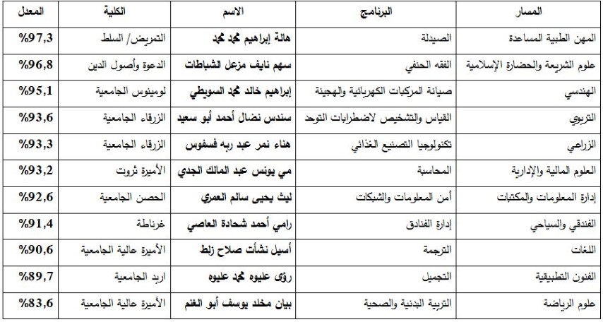 أوائل الطلبة بامتحان الشامل .. أسماء On يونيو 13, 2023 Share وكالة الناس – أعلن رئيس جامعة البلقاء التطبيقية الدكتور أحمد فخري العجلوني، أسماء الطلبة الأوائل في امتحان الشهادة الجامعية المتوسطة “الشامل”، بحسب المسارات والبرامج الدراسية الأساسية للخطط الدراسية الجديدة. وتاليا الأسماء :