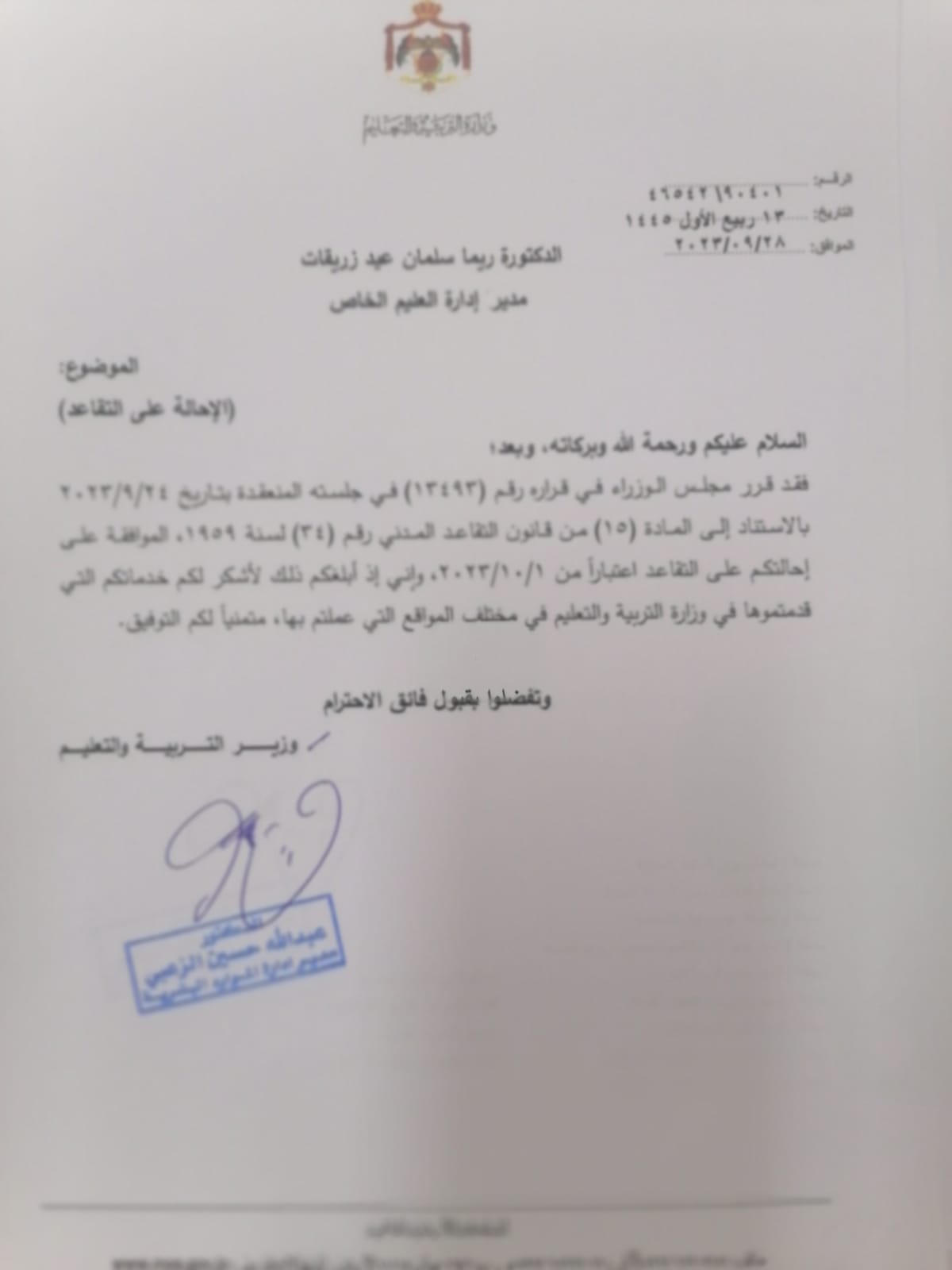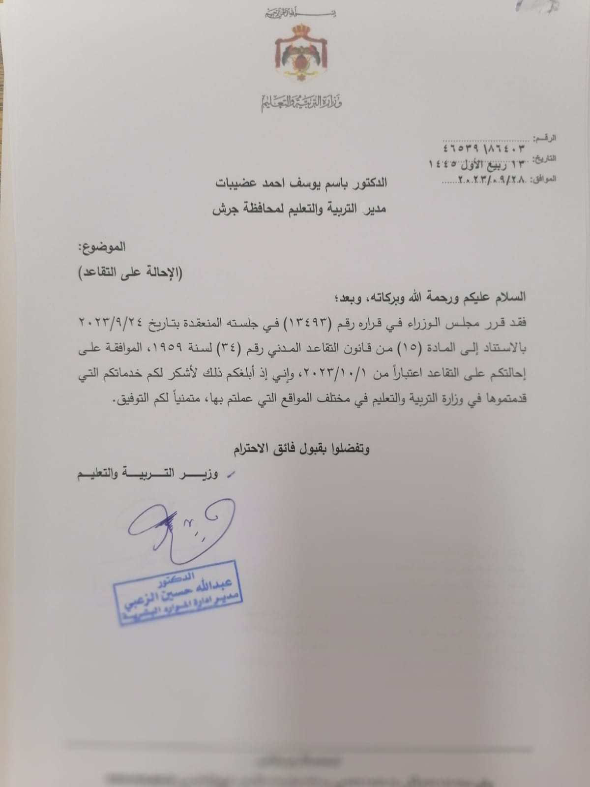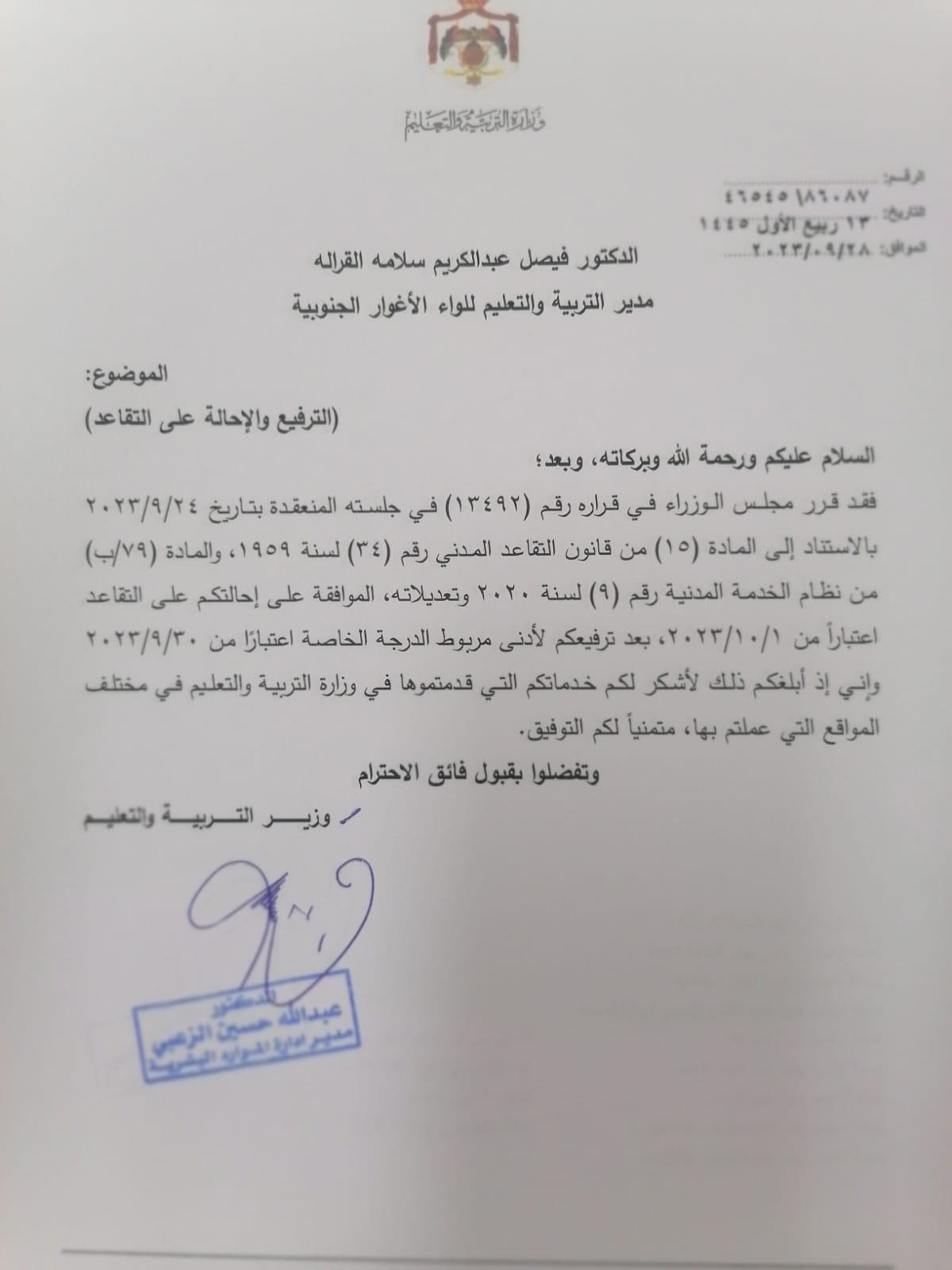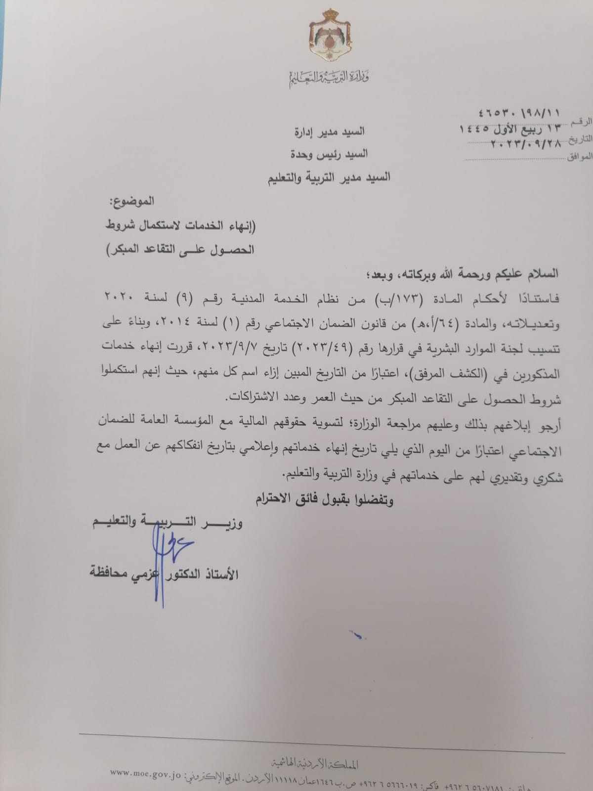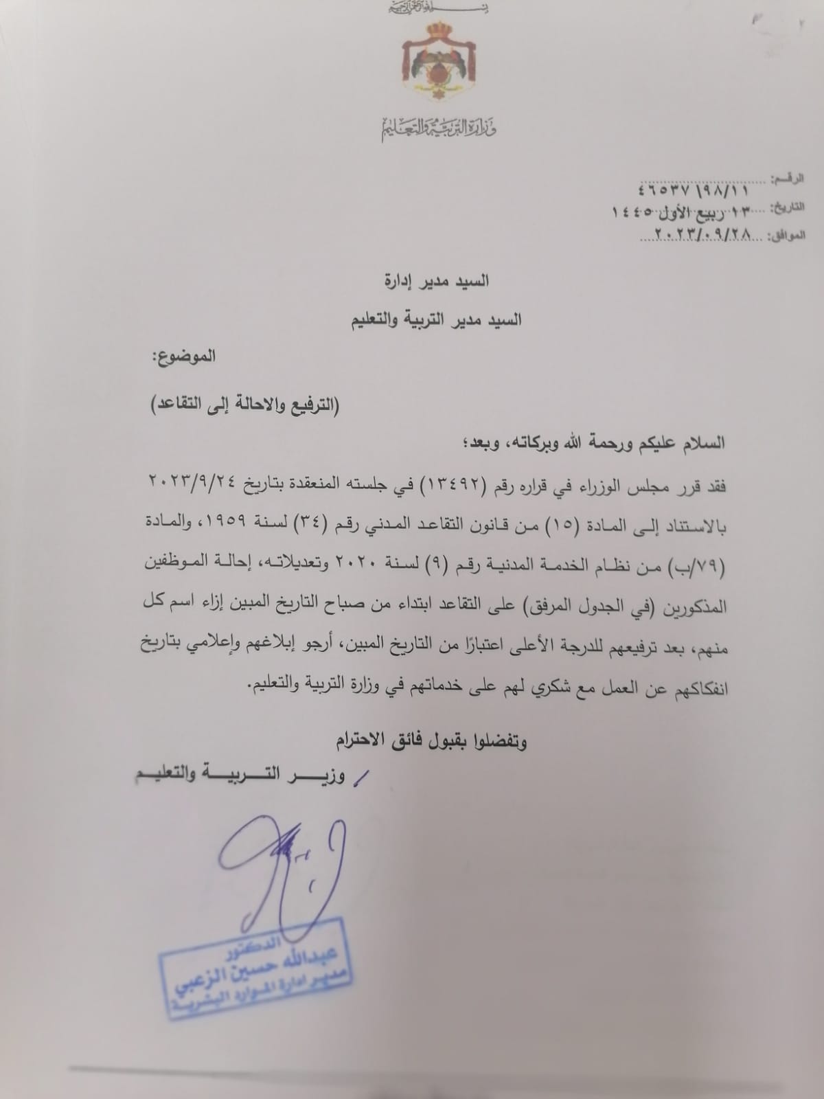 إحالات للتقاعد وتعيينات جديدة في التربية .. أسماء On سبتمبر 29, 2023 Share وكالة الناس – قرر وزير التربية والتعليم عزمي محافظة، الخميس، إحالات وتعينات جديدة، شملت مدراء تربية بالإضافة إلى مشرفين ومعلمين.