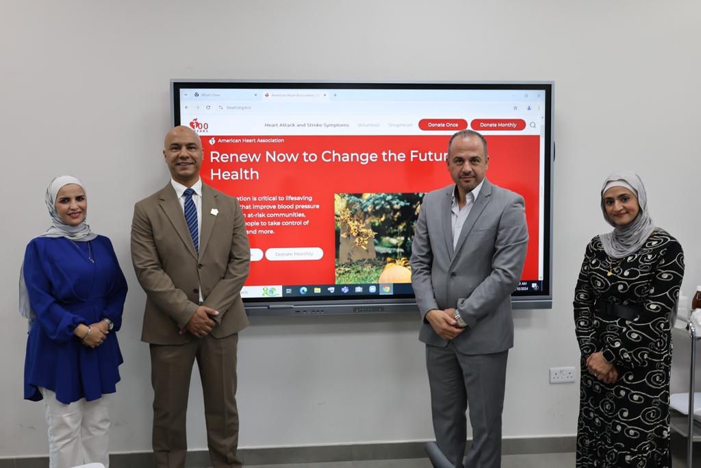 وكالة الناس -ستقبل الاستاذ الدكتور أحمد حمدان نائب رئيس جامعة عمان الاهلية للشؤون الأكاديمية (عميد كلية طب الاسنان) ، السيد محمد المزين المدير الاقليمي لجمعية القلب الامريكية في منطقة الشرق الأوسط، بحضور كل من الاستاذ الدكتورة ايمان النزلي عميد كلية التمريض والاستاذ الدكتور خلدون حمدان مدير مركز جامعة عمان الاهلية للتديب الصحي.