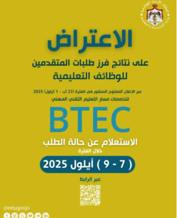 وكالة الناس -أعلنت وزارة التربية والتعليم عن نتائج فرز طلبات المتقدمين للوظائف التعليمية لغايات التعيين في تخصصات مسار التعليم التقني المهني BTEC، والمتقدمين من خلال الإعلان المفتوح الذي تم نشره خلال الفترة من 23/8/2025 ولغاية 1/9/2025.