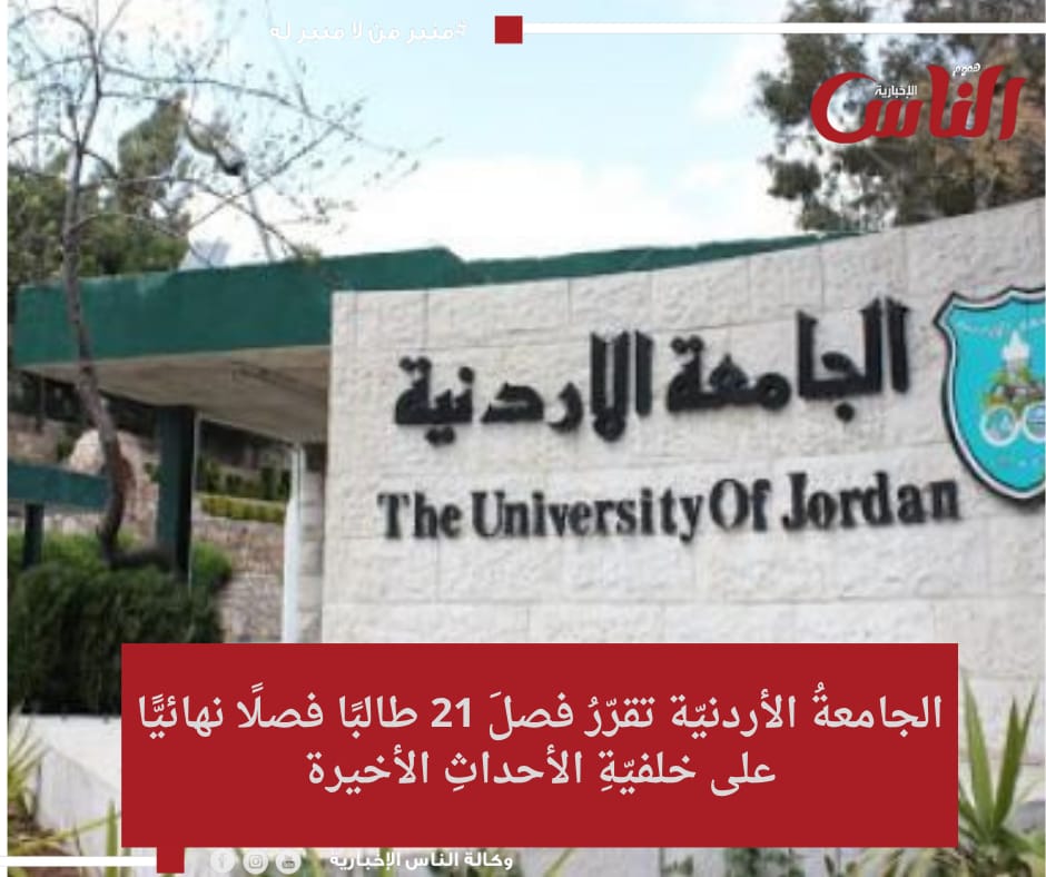 وكالة الناس -أعلنتِ الجامعةُ الأردنيّة استنادًا إلى نظامِ تأديبِ الطّلبةِ عن فصلِ 21 طالبًا فصلًا نهائيًّا، وذلك بعد ثُبوتِ تورّطهُم في الأحداثِ التي شهدها الحرَم الجامعيّ مؤخرًا، التي تسببت في الإخلالِ بالنظامِ العامّ وتعطيل سير العمليّة التعليميّة وإلحاق الضرر في بعض المُنشآت.