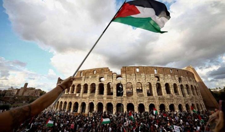 وكالة الناس – قام أحد المتظاهرين خلال مسيرة مؤيدة للفلسطينيين في قطاع غزة في العاصمة الإيطالية روما، بنزع العلم الإسرائيلي من أمام مقر منظمة الأغذية والزراعة (الفاو) التابعة للأمم المتحدة وتمزيقه وسط تصفيقات حارة من المشاركين.