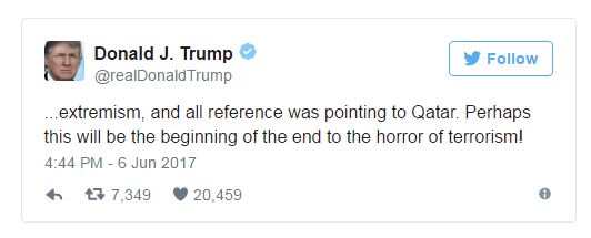 وكتب ترامب في تغريدة على تويتر ان دول الخليج قالت ‘انها ستعتمد نهجا حازما ضد تمويل التطرف وكل الدلائل تشير الى قطر’.