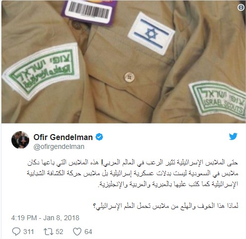 حتى الملابس الإسرائيلية تثير الرعب في العالم العربي! هذه الملابس التي باعها دكان ملابس في السعودية ليست بدلات عسكرية إسرائيلية بل ملابس حركة الكشافة الشبابية الإسرائيلية كما كتب عليها بالعبرية والعربية والإنجليزية.