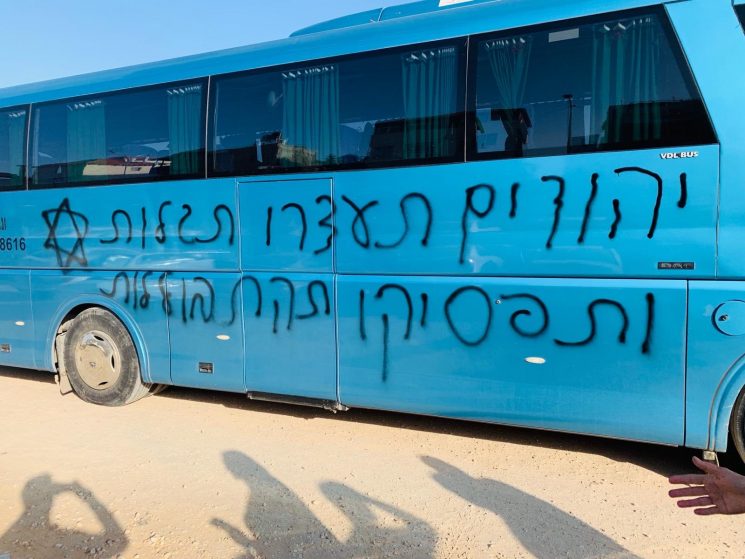 وفوجئ سكان قرية جلجولية في منطقة المثلث داخل أراضي 48 بإعطاب إطارات العشرات من مركباتهم ليل الأربعاء الخميس، وخط المعتدون على حافلة كتابات بالعبرية تقول: أيها اليهود، أوقفوا الشتات، كفوا عن الانصهار بالزواج من غير اليهود.