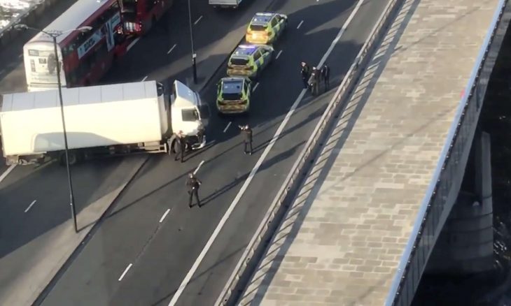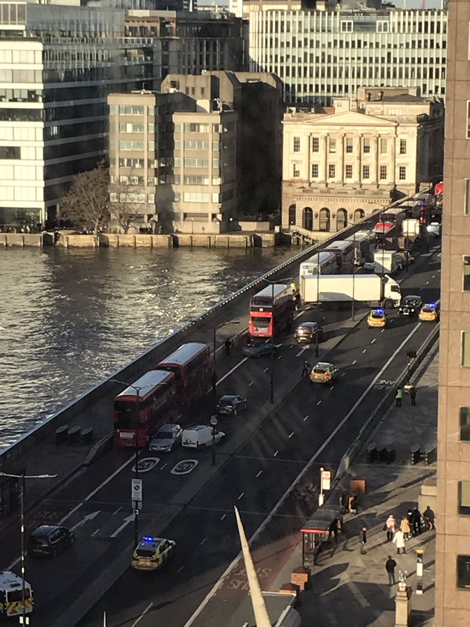 وأظهرت لقطات جرى بثها عبر تويتر مشاهد من الموقف قرب جسر لندن، تزامنا مع انتشار كثيف للشرطة، بينما بيَن أحدها بعض عناصرها في حالة تأهب على مسافة قريبة من شخص سقط على الأرض.
