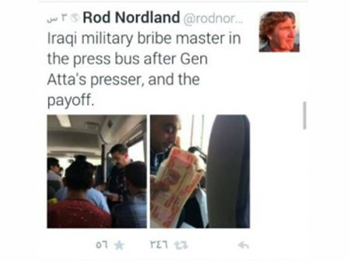 وكالة الناس – نشر مراسل نيويورك تايمز في العراق صوراً لمندوب قاسم عطا (المتحدث الرسمي باسم زعيم حزب الدعوة الحاكم نوري المالكي) وهو يرشي الصحفيين الذين يحضرون مؤتمره الصحفي في بغداد، وفي تغريدة له على تويتر قال المراسل إن سعر الصحفي في العراق الذي يدعم المالكي ويروج له انتصارات وهمية هو عشرين دولارا، واعتبر ناشطون هذا الفعل بالفضيحة الجديدة لقاسم عطا الذي يتهمونه بالكذب.