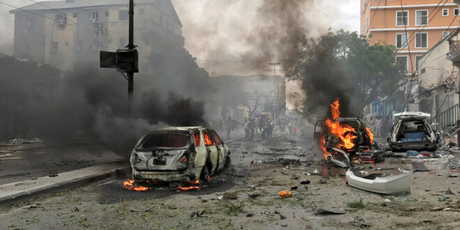 Vehicles burn at the scene of an explosion in Mogadishu, Somalia, July 30, 2017. REUTERS/Feisal Omar
