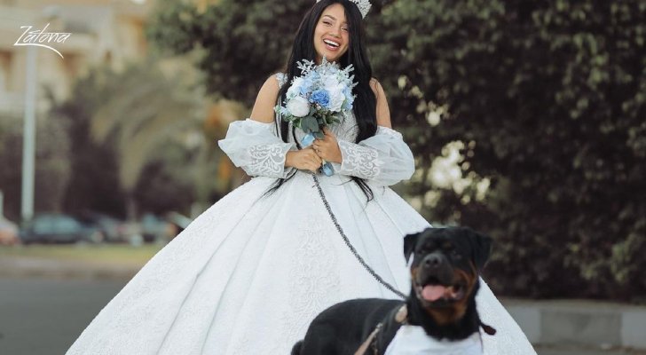 وكالة الناس – نشرت المدونة المصرية هبة مبروك صور لها عبر حسابها على إنستجرام برفقة كلب وعلقت في عنقه لافتة حفل الزواج.