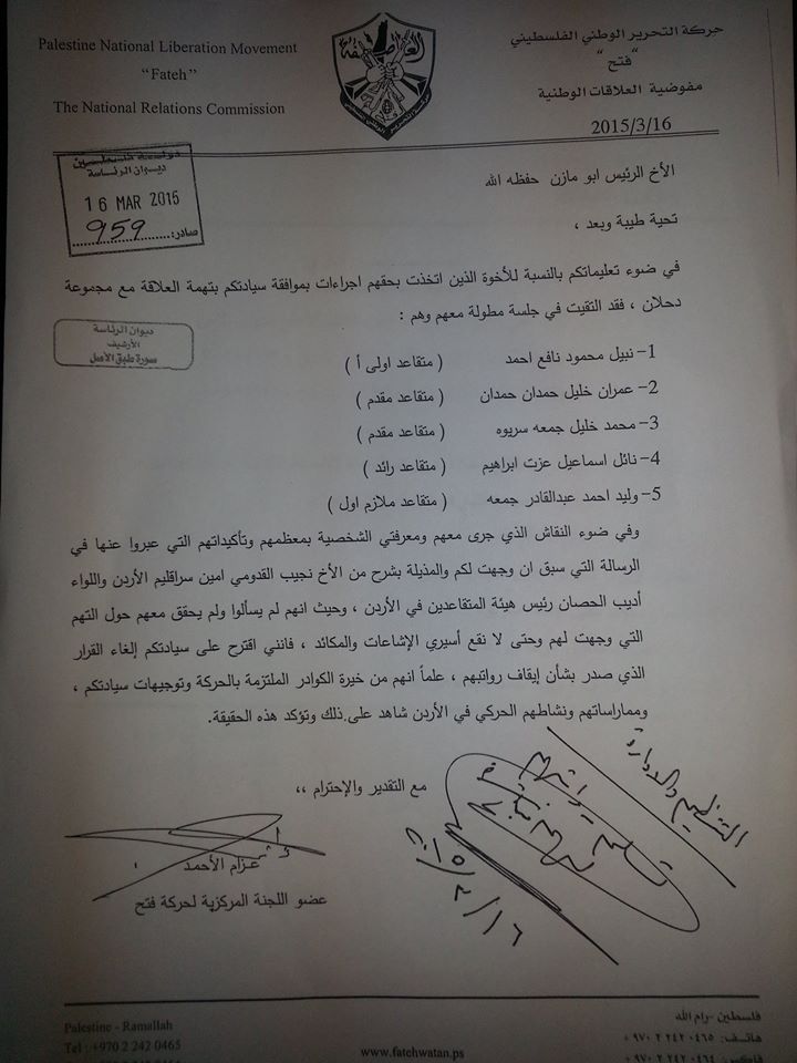 وفي الوثائق التي وقعت باسم عضو اللجنة المركزية لحركة فتح عزام الأحمد اشار بانه تم فصلهم دون مراجعتهم وسؤالهم.