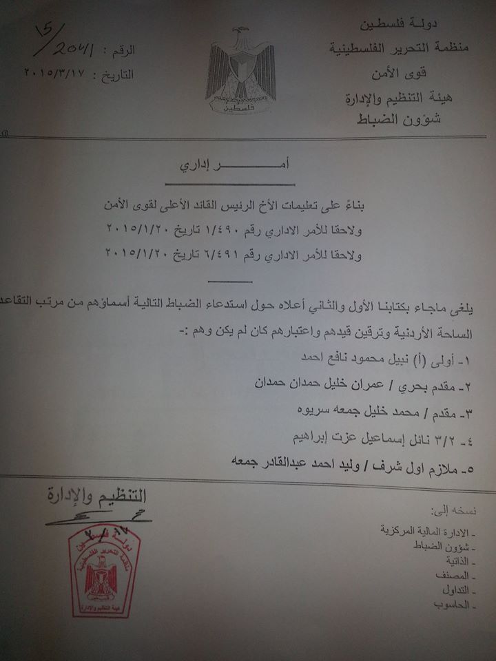 ومن المعروف أن الامر الاداري الصادر عن التنظيم والادارة في السلطة الفلسطينية مبني على قرار تنظيمي في حركة فتح وهو خلط واضح كالعادة بين التنظيم والوظيفة العامة بالسلطة كما يحدث مع كوادر غزة ) والأدهى أنه سبقه قرارات كما هو موضح باعادة المستهدفين من التقاعد للخدمة مرة اخرى بهدف فصلهم ووقف رواتبهم !! ثم يتم التراجع عن القرارات باكملها التي هي من الاصل لم تكن قانونية !! أين يحدث في كل العالم ان تتم اعادة متقاعد للخدمة بهدف فصله.كما تظهر الوثائق.