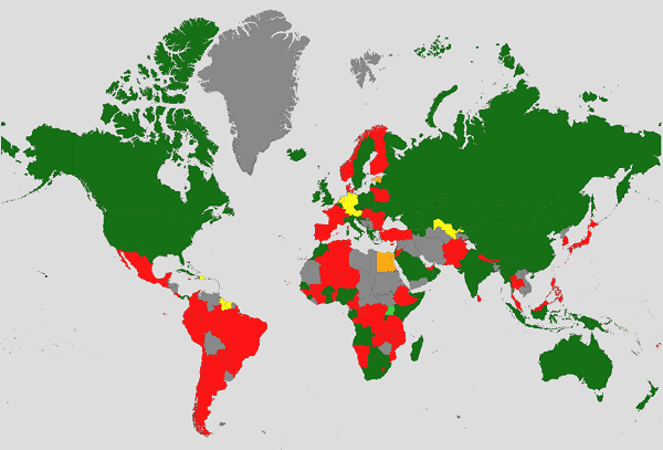 وإلى جانب معظم دول أوروبا، تم تصنيف المملكة المتحدة على أنها “منخفضة” المخاطر، وكذلك الولايات المتحدة وكندا وأستراليا.
