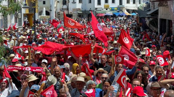 ورفع المتظاهرون الأعلام التونسية ورددوا هتافات من بينها “لا استشارة لا استفتاء شعب تونس قال لا” و”أوقفوا مهزلة الدستور” و”نريد استعادة البلد المخطوف” و”الشعب جاع”.