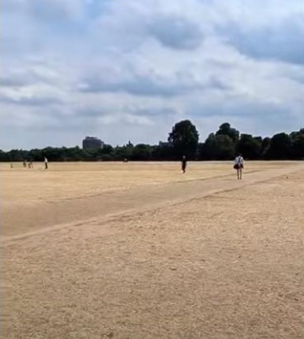 وأوضح الفيديو المتداول، كيف اختفى العشب الأخضر الذي كان يزين الحديقة اللندنية، والتي تعد من أهم وأجمل حدائق العالم.