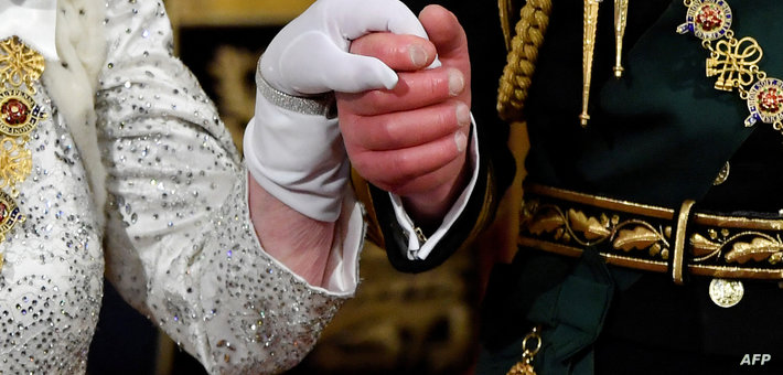 صورة التقطت في 14 أكتوبر 2019 حيث تغادر إليزابيث الثانية مع ابنها تشارلز بعد إلقاء خطاب في مجلس النواب في لندن