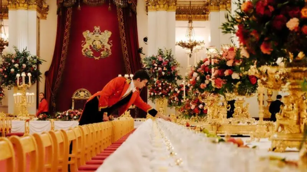 1. تقوم الملكة شخصياً بالإشراف على المأدبة عند استضافة الزيارات الرسمية. تتفقد الملكة بنفسها المائدة المصممة على شكل حدوة حصان في فترة ما بعد الظهر قبل المأدبة ، وتتحقق من الاستعدادات مع المسؤول عن المأدبة.