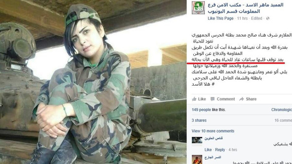 ومع أن توقف القلب لساعات، يعني الموت المحقق لصاحبه، إلا أن الصفحات الموالية لرئيس النظام السوري، لم تجد حرجاً في ذكر المبرر الذي جعل ‘الملازم شرف هناء صالح محمد’ تعود الى الحياة وبعد أن ‘نعيناها شهيدة’ فقد ‘أبت إلا أن تكمل طريق المقاومة بعد توقف قلبها ساعات عاد إلى الحياة وهي الآن بحالة مستقرة’.
