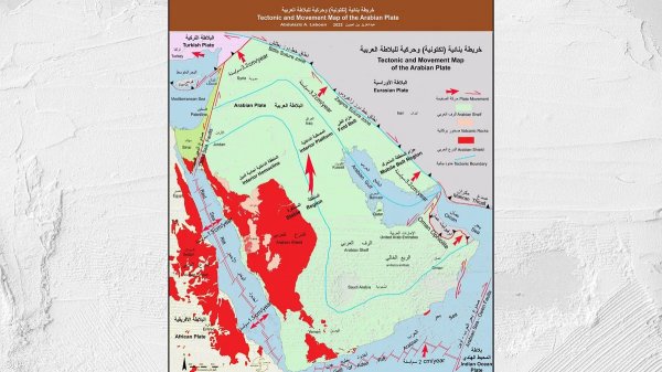 وأضاف أنه “نتيجة لتلك الحركة تكوّن واتسع البحر الأحمر وخليج عدن، واصطدمت الصفيحة العربية بالصفيحتين الإيرانية والتركية وتكونت سلاسل جبال عمان، وزاغروس في جنوب غربي إيران، وجبال طوروس في جنوب شرقي تركيا، وتكونت سلسلة من الصدوع التحولية على امتداد خليج العقبة-البحر الميت وشمالًا، وسلسلة صدوع خليج عدن-بحر العرب (خط أوين)”.