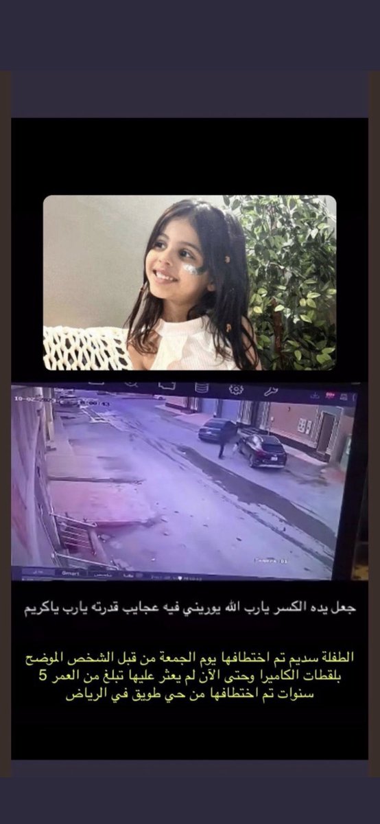 سديم سلطان العشي طفله عمرها ٥ أعوام وحيدة امها اختطفت نهارا جهارا ووثقت ذلك كاميرات الجيران.