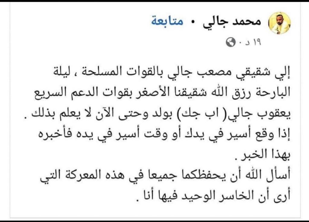 وكتب محمد عبر فيسبوك: “إلى شقيقي مصعب جالي بالقوات المسلحة، ليلة البارحة رزق الله شقيقنا الأصغر بقوات الدعم السريع يعقوب جالي بولد وحتى الآن لا يعلم بذلك. إذا وقع أسيراً في يدك أو وقعت أسيراً في يديه فأخبره بهذا الخبر. أسأل الله أن يحفظكما جميعاً في هذه المعركة التي أرى أن الخاسر الوحيد فيها أنا”.
