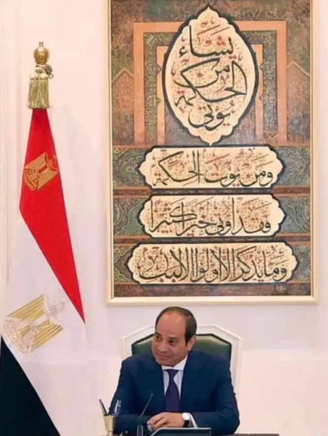 تداول ناشطون عبر مواقع التواصل الاجتماعي صورة للرئيس المصري عبدالفتاح السيسي خلال اجتماع في العاصمة الإدارية الجديدة، فيما ظهرت خلفه لوحة تحمل آية قرآنية.